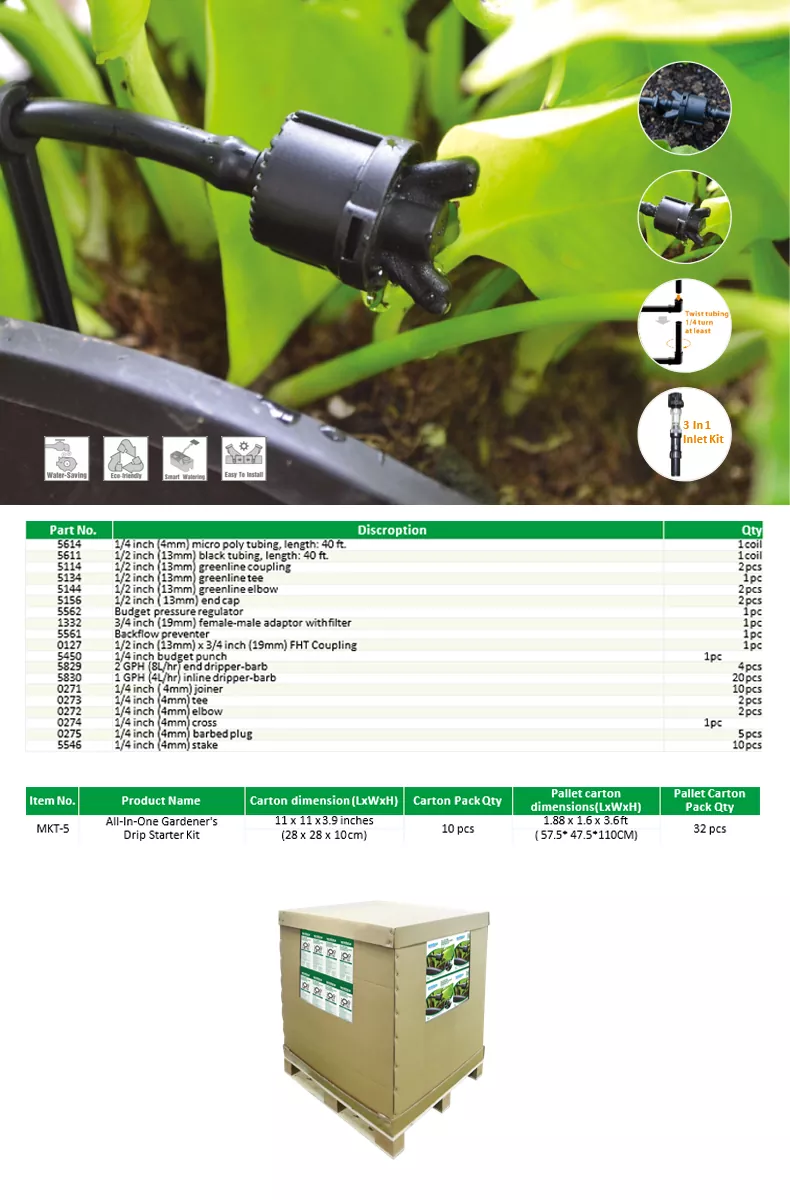 オールインワンの庭師点滴スターター キットは、独自の灌漑システムを構築するのに役立ちます。点滴灌漑キットは、農業、園芸、家庭園芸のニーズを満たす効率的で節水のソリューションです。植物の根に直接水を供給し、無駄を最小限に抑え、植物の健康を最大限に高めます。