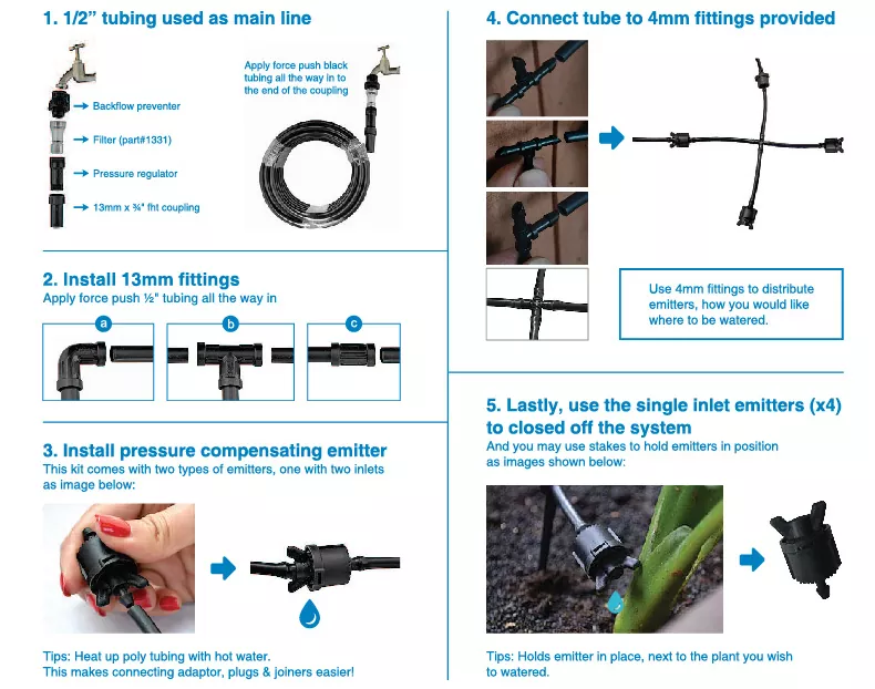 簡単な取り付け: フレキシブルチューブ、エミッター、コネクターを備えたDIYセットアップ用に設計されています。