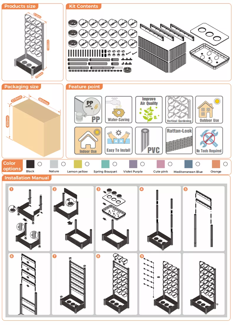 レタスやチェリートマトなどの一般的な野菜を育てたい場合でも、ローズマリーやミントなどのハーブを育てたい場合でも、さまざまな形の多肉植物や色とりどりの花を育てたい場合でも、自立式パティオ バーティカル ガーデンはそれらに完璧に対応できます。自分の好みに合わせて自由に組み合わせて、自分だけのバーチカルガーデンを手作りして、DIYガーデニングならではの楽しさを体験してください。